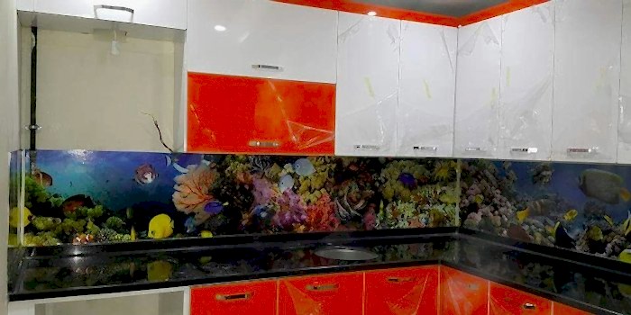 Tezgah arası cam, mutfak tezgah üssü ve dolap arasında bulunan kısma UV baskı cihazından alınan görüntüyü temperli cam üzerine aktarılalarrak milimetrik hesaplarla silikonla yapıştırmak suretiyle modul led yapısı kullanılarak hazırlanan mutfak dekorasyon ürünüdür.